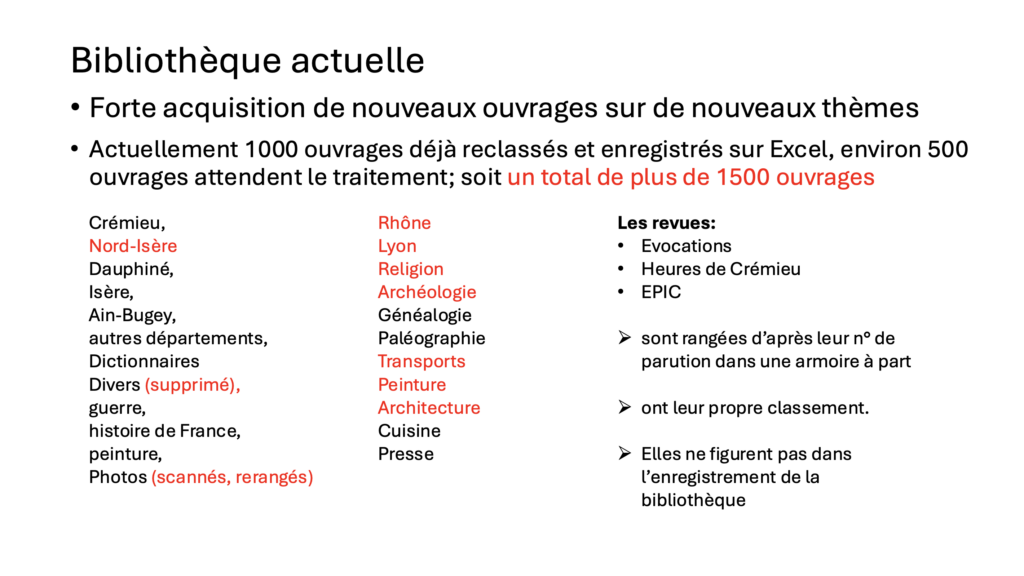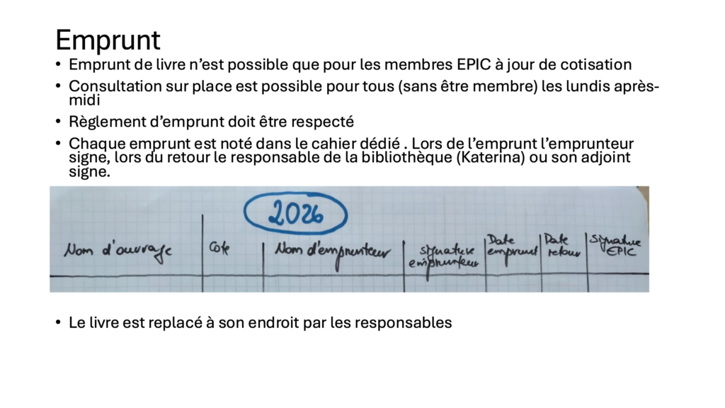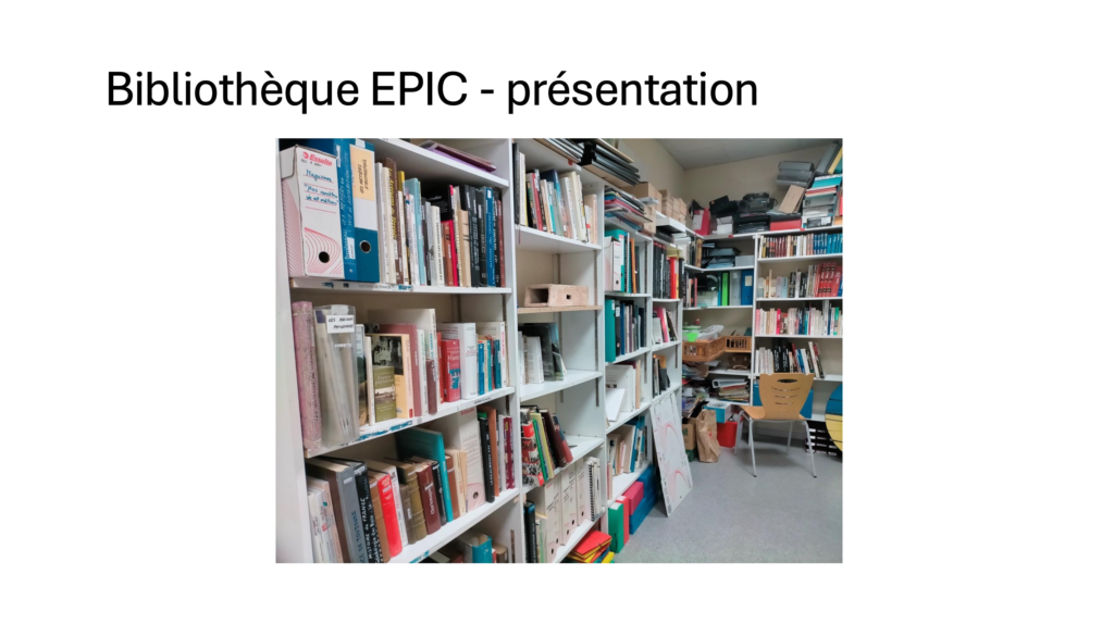 La bibliothèque EPIC, à disposition de tous, adhérents et public, s’étoffe, s’enrichit avec le temps. Alimentée par les membres du bureau, des conférenciers passionnés et des bénévoles, elle offre des bulletins, revues et documents dont vous trouverez le listing ci-contre.
