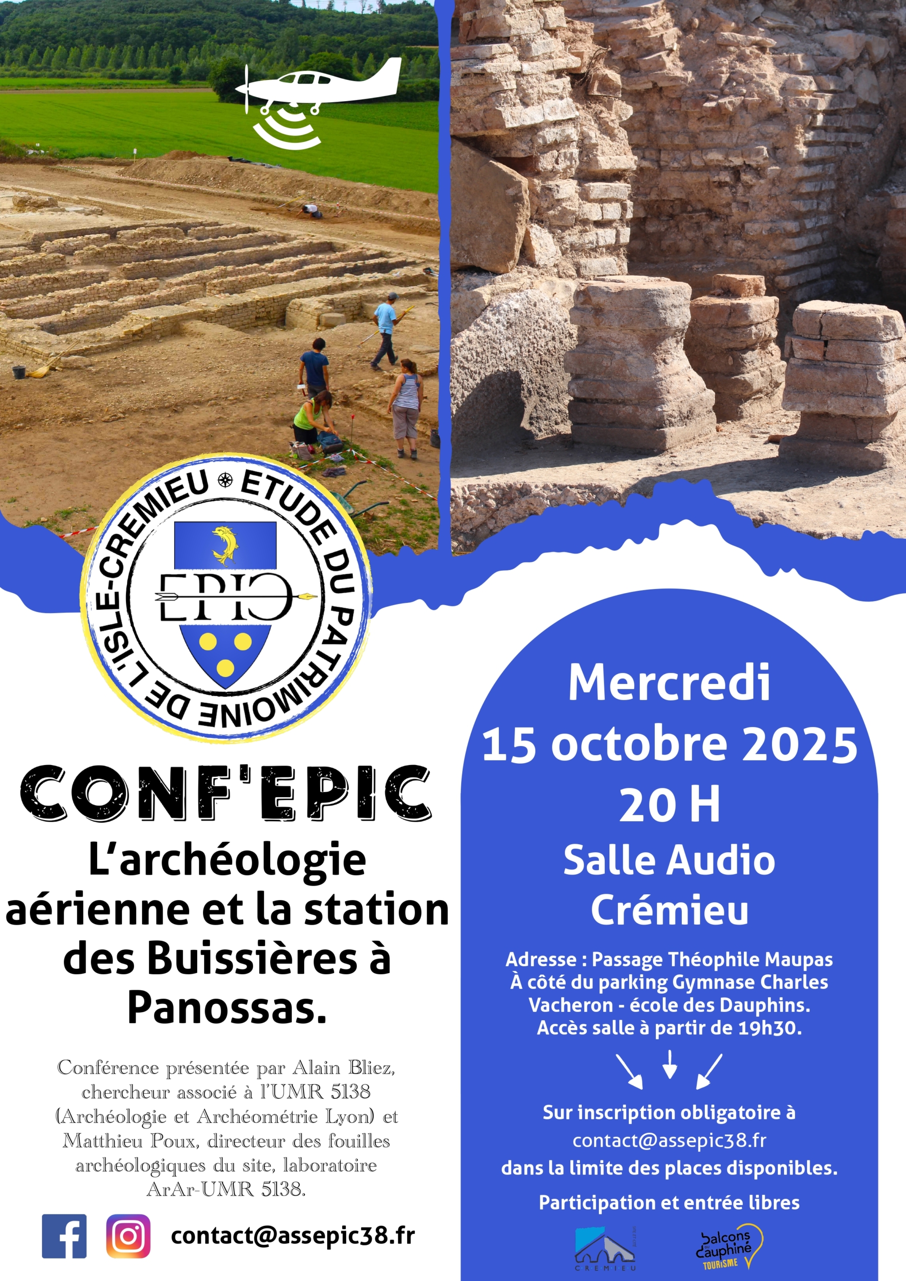EPIC vous invite à découvrir l’archéologie aérienne et la station des Buissières à Panossas. Conférence animée à deux voix : Alain Bliez pour la partie concernant l’archéologie aérienne et Matthieu Poux, directeur des fouilles archéologiques du site. L’ensemble archéologique est exceptionnel en Isère et même en France. Beaucoup de vestiges de grande qualité ont été mis au jour.